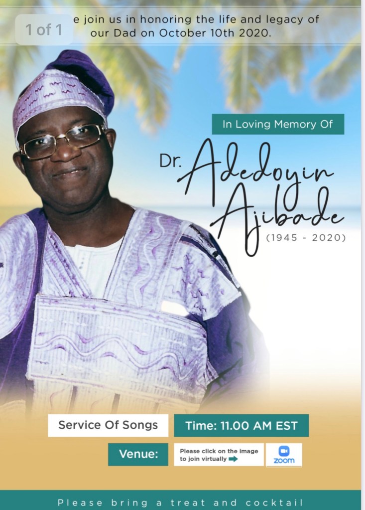 This was the take home message from a Zoom home-going celebration I attended yesterday. Papa Ajibade as we all fondly called him was well-loved. He was a funny man, always the life of the party, generous to a fault and a gem to his six children. End of year parties at his house were a delight growing up and some of my best childhood memories of happiness, laughter, love and dancing occurred at his home. So when we heard he passed away, our hearts sank.