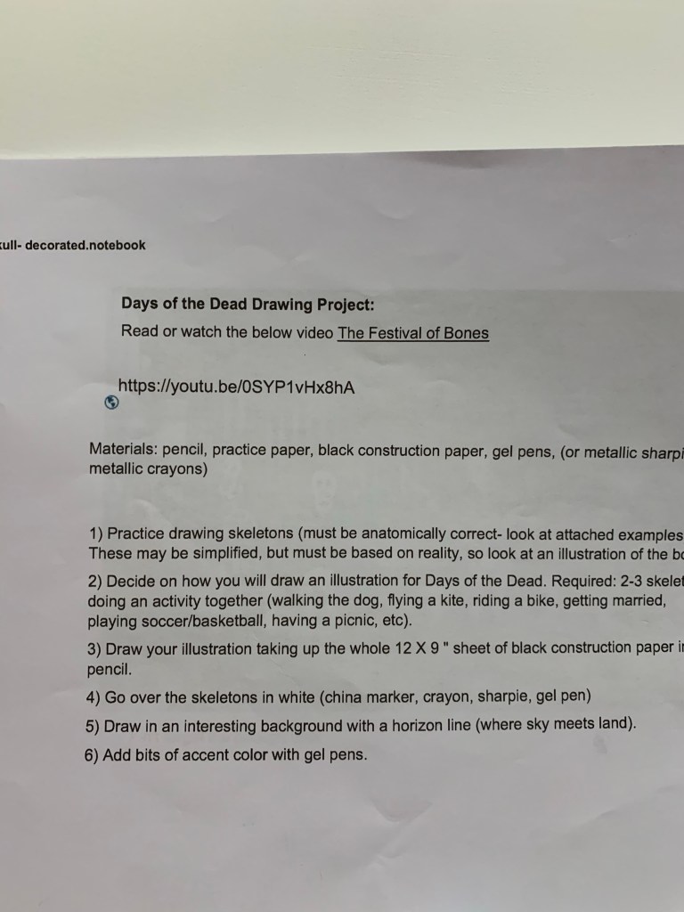 For art this week, my third grader made a unique, ravishingly beautiful but simple depiction in celebration of the Day of the Dead. The instructions were simple. Watch the Festival of the Bones book on YouTube, then draw skeletons in white in an interesting background highlighted with a bit of accent color and gel pens. The cute, funny book, Festival of Bones by Luis San Vincente is a delightful read, apt for her assignment and this weekend’s celebration about the Day of the Dead. But it’s my daughters drawing, her focus on rethinking the architecture of skeletons, to mark out a space where even skeletons can flourish via the possibilities of her imagination, that I keep today.