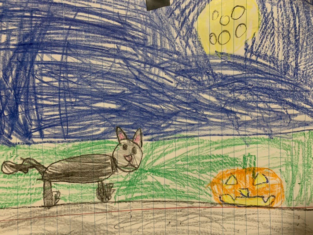For my 3rd grader, learning is expressive. Like the way she draws everything for every occasion like Halloween yesterday, a black cat and jack-o-lantern. Or the way she took a short story she wrote and made it into a chapter book, now with 12 chapters and counting. But as if that’s not all, learning, especially our poetry sessions once a week is about normalizing the mistakes she makes with reading poetry, repeating the process over and over, despite whatever setbacks she feels, until she becomes comfortable, even confident with the words and her understanding of the power of language. For my junior kindergartener (also for his brother and sister) learning occurs within a complex network of people, places, nature, and things. Like with our Sunday walk around the amazing Forest Park in search of the Dinosaur Park (will make a keep story of this soon) or with making leaf man out of dry leaves he picks along our walks during this glorious Fall season. Learning is everywhere, something he does everyday, without any curriculum, just part of his daily living.