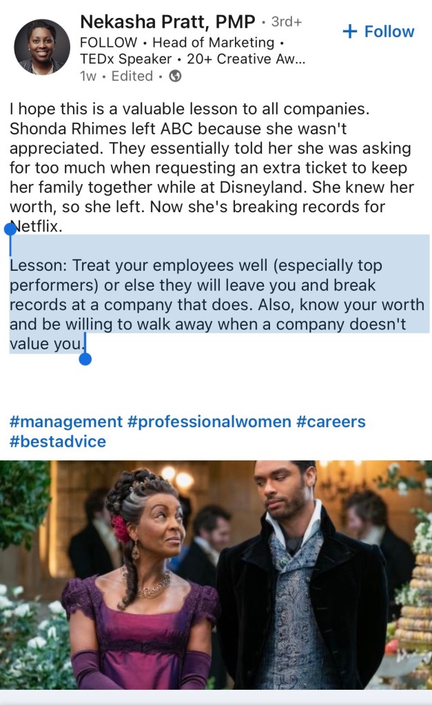 I saw a post on LinkedIn that made me pause for moment. So many things are insightful there. But this one by Nekasha Pratt, a marketing guru made me reflect for a moment. It was about Shonda Rhimes and her departure from DisneyAbc. I have written about this in the past but this post was a reflection on Shonda’s success at Netflix. Shonda’s new show Bridgeton has garnered 63 millions viewers in December. The highest and record breaking viewership for the streaming channel. Ms. Nekasha shared a lesson: ‘Treat your employees well (especially top performers) or else they will leave you and break records at a company that does. Also, know your worth and be willing to walk away when a company doesn’t value you.’
