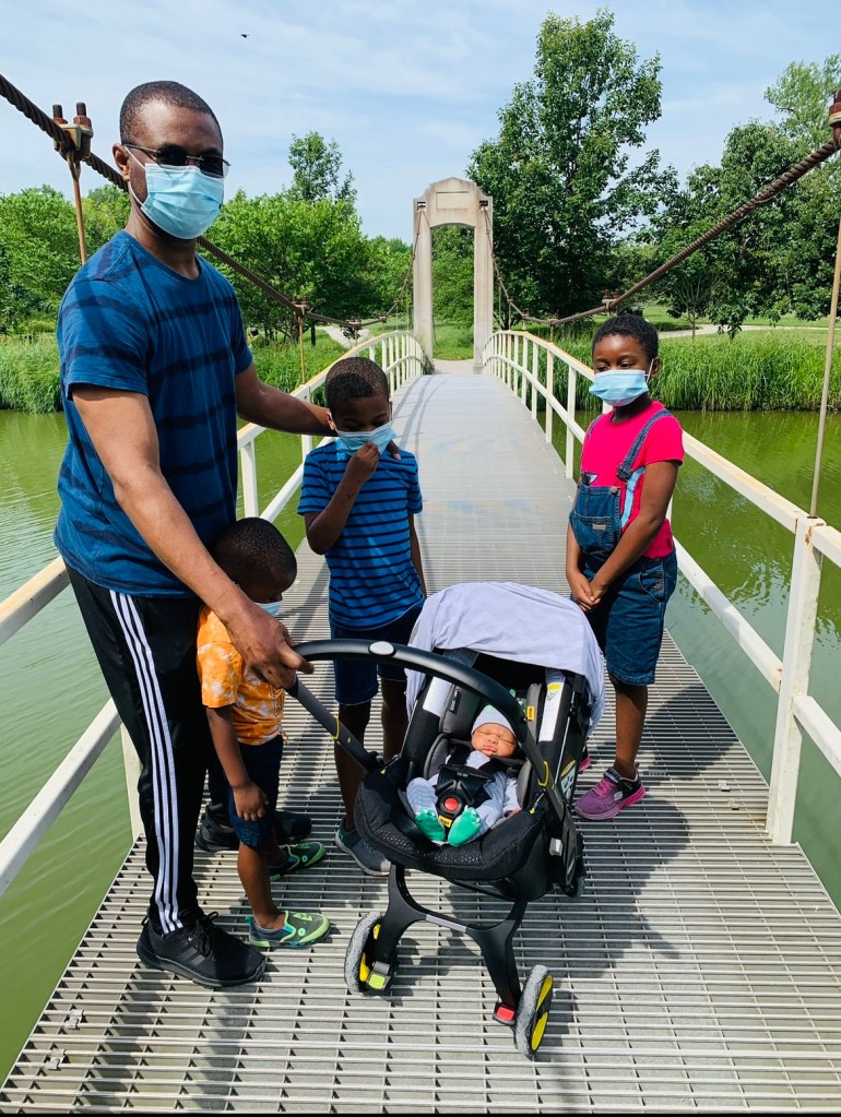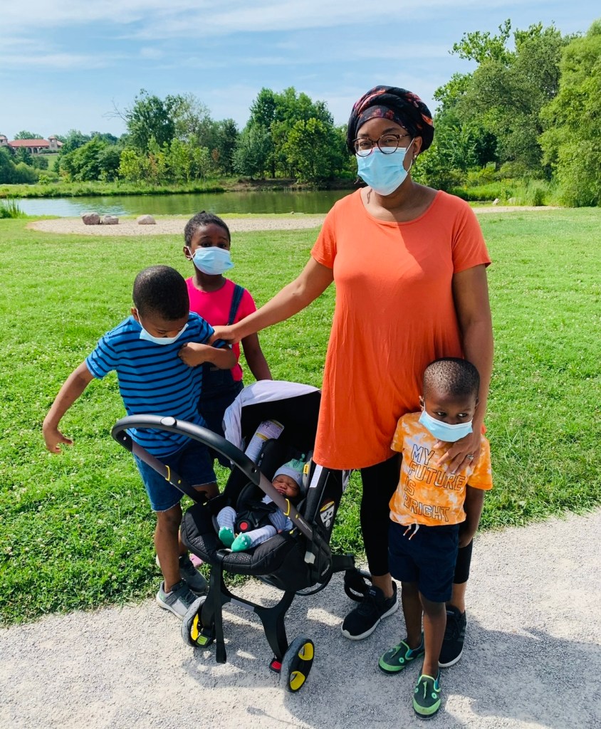 As we crossed the bridge along the park, we stopped to take photos with baby. We gathered ourselves around baby, who laid gently in his stroller. With the sky still brightening the day with the most perfect of blues, and with heads held up, with perfect eyes smiling beneath our masks, we took a photo to capture this moment in time, a moment we first walked together with baby.