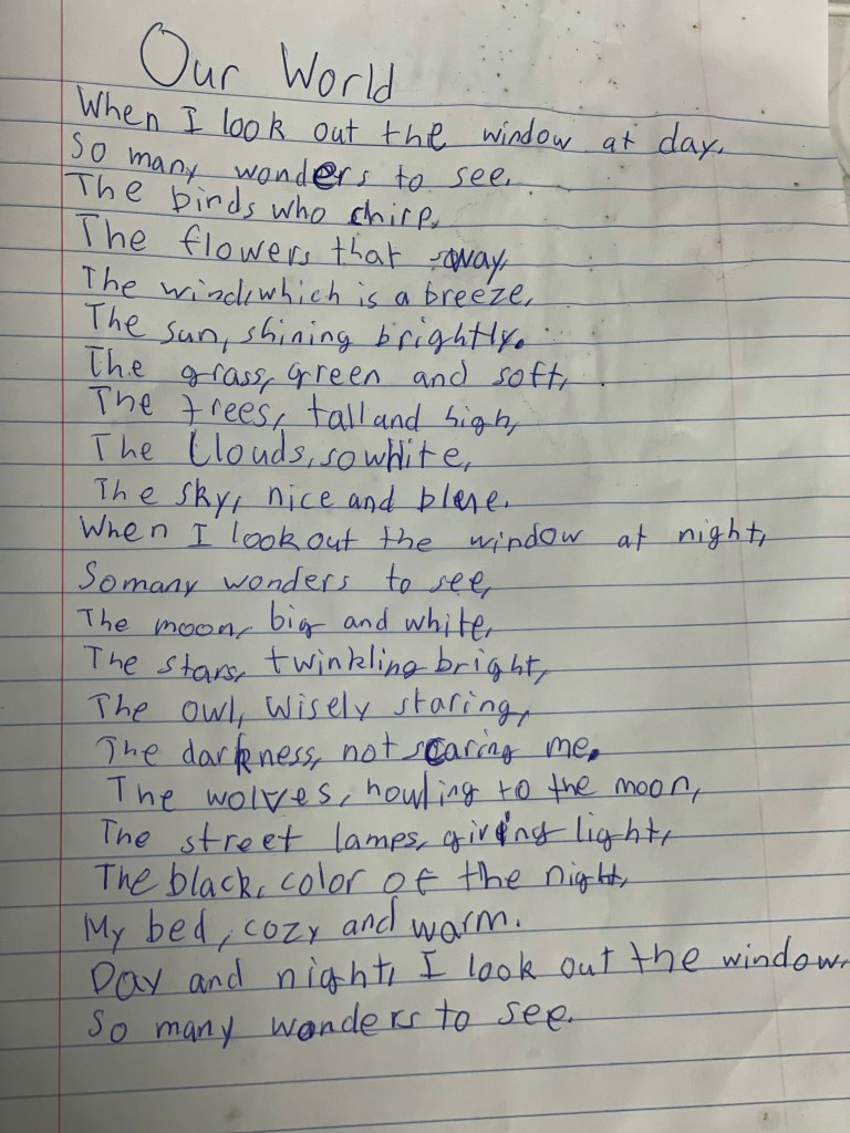 My daughter wrote a poem about our world. A simple poem about so many wonderful things to see, whether day or night. Like birds who chirp or flowers that sway. Next to tall trees, or beneath blue skies. Day time has wonders for all to see, she notes. But night time too, with a big moon and stars that twinkle or owls that stare wisely, are just as brilliant as the day. Wolves howling to the moon or the color of the night, like day, even night she notes, has many wonders of its own. It’s simple and from her childlike mind. This simplicity, written on wide-ruled paper with blue ink, personifies the mood I’m in these days. No need for noise. No need to an audience too. Simple will do. Like day and night. Simple has wonders, if only we stop to see it. It’s my keep for today and always. Keep simple, my daughter’s gift to me and it’s many wonders to see.