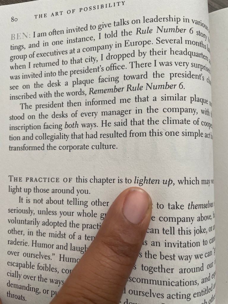 In the art of possibilities, the Zanders shared Rule #6. It’s about how two leaders where sitting in privacy, discussing affairs of state. One of the leaders, whom I’ll refer to here as leader 1, had a staff who bursts into the meeting with fury, shouting and banging fists on a desk to which leader 1 admonishes him and says ‘remember rule #6.’ The staff apologies and withdraws from the room. Shortly after this, another staff to bursts hysterically, gesticulating wildly to which the leader again states ‘remember rule #6.’ The same scene happened again and leader 1 reminds them again about the rule. After a moment leader 2 finally asks, but what is rule number 6. Leader 1 replies ‘Don’t take yourself so goddamm serious.’ The intent of the rule is to ‘lighten up’ or at least help those around you to do the same. When we do so, our central selves shine, or the part of ourselves that remarkably generative, prolific, even creative.
