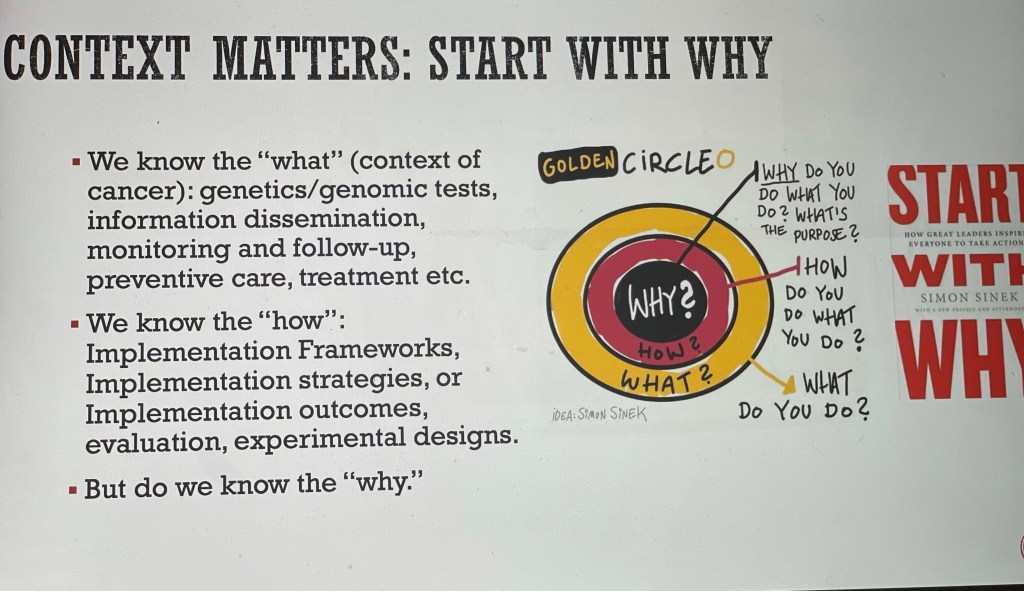 Another reason why context matters is that, the past couple of days was spent on ideas of what works with implementations, the how to do it literature of implementation science, and to all of that I want to add one thing that was missing and is this idea of starting with Why. And So for implementation science in the region, always start with why.