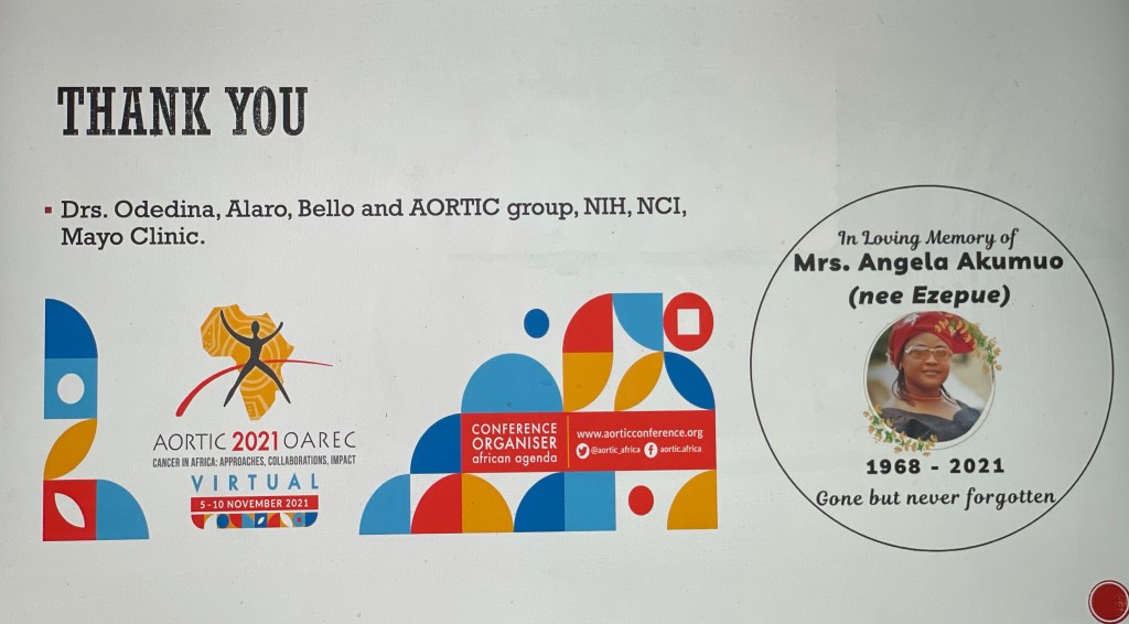 Thank you to the organizers of this conference for allowing me to speak, Drs. Odedina, Alaro, Bello, I thank you for the invitation. Your invitation came at a time when my family was dealing with the stage 4 cervical cancer burden of Angie my Sister in-law. We lost her to cervical cancer this past August 12th. But I give this presentation in her memory for the many other Angies we all have to fight like hell for, so they live, in a region where context matters. Implementation science needs more storytellers and I hope that AORTIC works to cultivate the next generation of storytellers truly making a difference in word and deed for cancer research in the region.