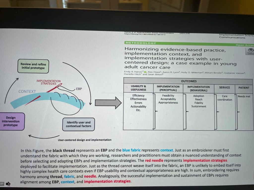 And as you do, as you pick out which outcomes, or frameworks or strategies you will use, be prepared to optimize them for your context. Many of them will not fit ERIC, storytelling isn’t in ERIC as an implementation strategy and that’s ok.