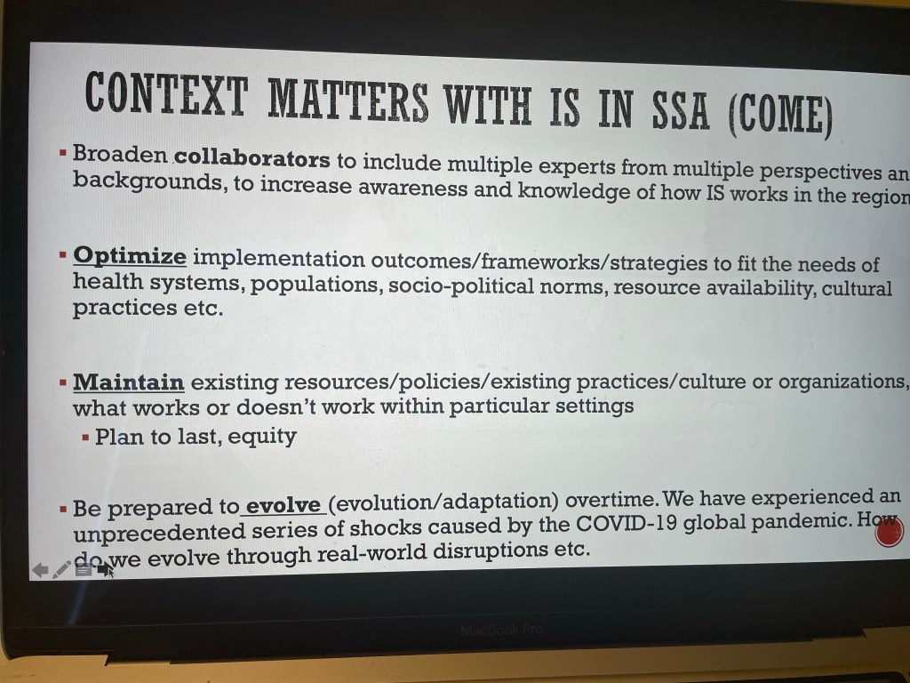 I say go for what works for you, let all that was shared these past few days be a guide, so long as you remember your why and that your context matters. This is the time to begin to galvanize efforts to decolonize even all we know with implementation science and just because it has been done in the West doesn’t meant it has to be in your setting.