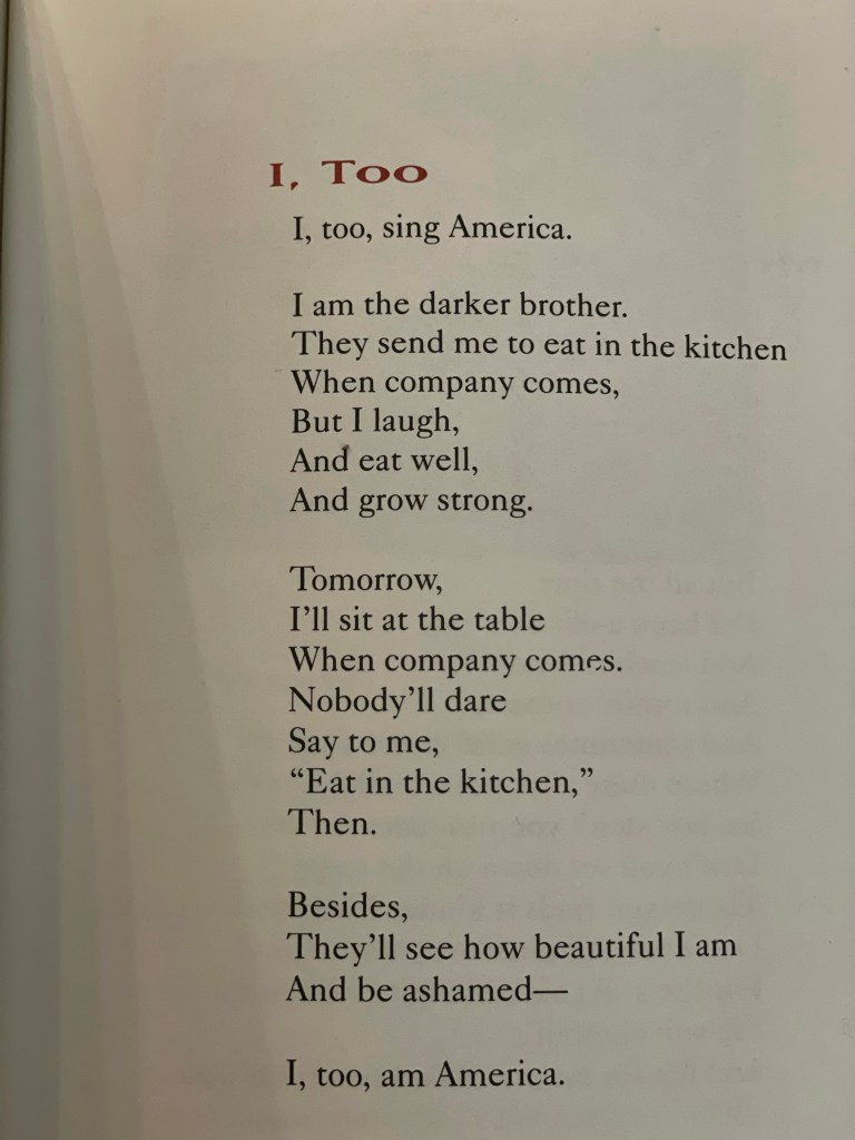 Langston Hughes has a poem entitled ‘I Too.’ It’s based on Walt Whitman’s classic ‘I Hear America Singing.’ For some reason, I saw the poem today while sifting through my Langston books. It got me wondering, and with all we have endured this year in 2021, just how would America sing? For sure, she would sing of being sick. Omicron has me exhausted. I’m tired and would like to really see the end of the tunnel with this pandemic. I also realize we have a long way to go if we continue along this path of not vaccinating the world. Don’t get me started on those including children under 5 that are not vaccinated. I fear for my kids under 5. Then there are the violence, a 14 year old killed while shopping with her mother, or kids killed at school for doing what they are supposed to be doing, going to school. Then there is poverty. My family and I spent Christmas eve taking care of homeless people in Saint Louis and let’s just say I am overwhelmed. Why can’t we get to the bottom of homelessness or poverty in general? I share all this to say that if Walt or Langston were to write their poem today, for sure, they would both be on track with where we are as a country, but also we would be sicker, more violent, and definitely poor. Hence my take below.