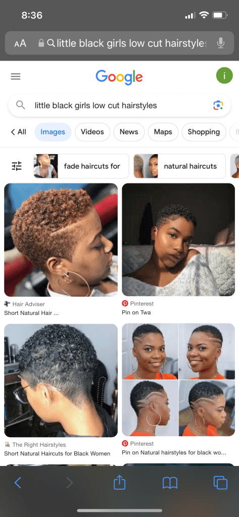 We all have to get rid of certain things that weigh us down and honestly for little girls in America, hair is one of them. I grew up with low hair cut at her age and never really understood why I had to do anything to my hair. It allowed me focus and I came into my own, never worried about what I looked. I share this to say, at her age, I also had no hair. I would have preferred we approached this differently but since this is the bed she decided to make, well, I look forward to making the most out of this experience with her, with joy, with pride, of all that she can be, just as she is meant to be. In the meantime, to encourage her of potential looks she could carry with her short hair, I googled for black girls with low cut hairstyles. Try it yourself. There are none. Only young or older women.