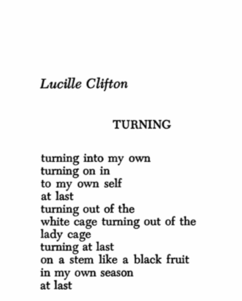 It’s for this reason I love this poem by Lucille Clifton. This idea of turning into your own self. At last. Turning out of white cage, turning out of the lady cage, turning at last on a stem like a black fruit in its own season at last.