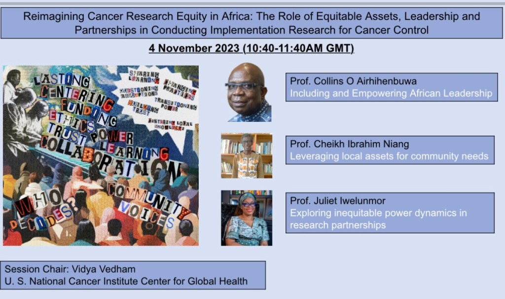 Over the years, our relationship has evolved from mentoring to what Toni Morrison once described as Rootedness. I know who I am without what I do. These days our one-on-one meetings are sort of timeless, bearing witness to dialogue that is benevolent, instructive, protective, and providing a certain kind of wisdom that helps us both soar from the ground to the skies above. They say we are nothing without the elders that lead us. Also to never forget how the journey began. I stand because he first saw what I never knew was in me. I stand because he gave me permission and wings to fly. I stand because he first saw my dreams that I felt were too big, law, health, human rights, cultural rights, yet he patiently waited to help me excavate it to what it has become today. I stand because I learnt the meaning and power of being seen, speaking truthfully, gaining independence, and what it means to dream. Only dreaming saved me in academia and I am nothing, in academic spaces without the wisdom and guidance of Dr. Airhihenbuwa. I stand for his knowing so deep. To now travel with him in this next phase of my career, speaking from the heart about all the ways we diversify research excellence and equity, while pushing to last with stories we tell, our way, is the gift I never knew was in my cards looking back. With Dr. Vedham moderating and the wisdom of Dr. Niang guiding our discussion, this will be sterling.