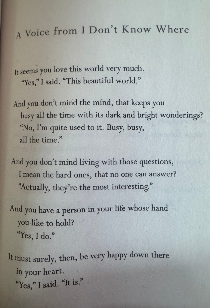 If I was to listen to all the voices within from all the places that I don’t know where, if I were to share all the lessons keeping words have taught me, as I crossed the 1000 notes threshold yesterday, the word felicity would come to mind. Yes, because I just finished reading Mary Oliver’s book of poetry entitled Felicity. But more so for the poem below, she wrote about a “voice from I don’t know where.”