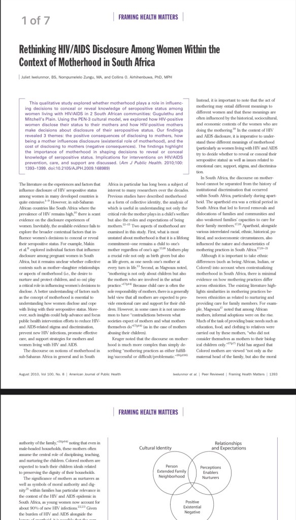 The second paper I authored as I began my academic journey highlighted the need to focus on the role of mothers with health. It’s the first paper that centers the primacy of mothers for health and life. It’s also began my journey into understanding the full spectrum of mothers, how we are not only birth givers but live givers. This quote in the paper exemplifies this for me: “First, what is most unstated about motherhood is that it is a lifelong commitment—one remains a child to one’s mother regardless of one’s age. Mothers play a crucial role not only as birth givers but also as life givers, as one needs one’s mother at every turn in life.”