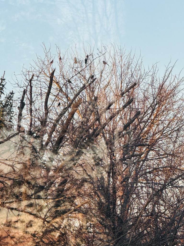 They circled a tree over and over again, perching to rest but flying around again, until there were more, each one perched on a different branch, but all of them together.